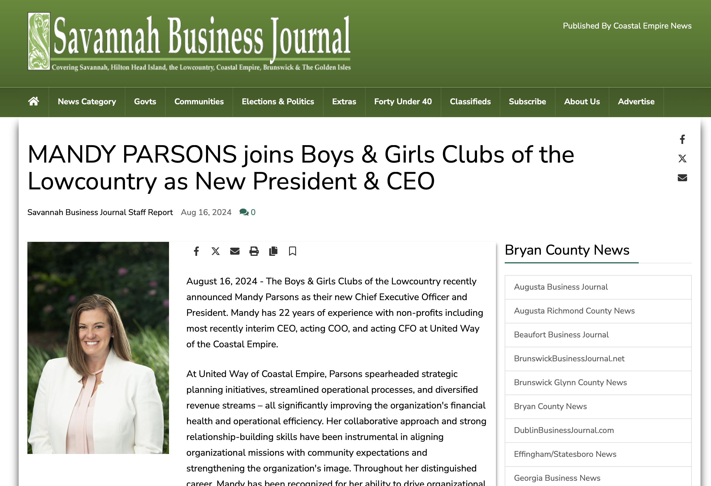 The Boys & Girls Clubs of the Lowcountry recently announced Mandy Parsons as their new Chief Executive Officer and President. Mandy has 22 years of experience with non-profits including most recently interim CEO, acting COO, and acting CFO at United Way of the Coastal Empire.